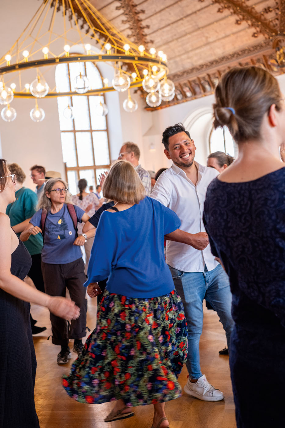 Diese Tanztreffs – die übrigens auch vor dem Münchner Kathreintanz stattfinden – sind nach wie vor das wichtigste Instrument der tänzerischen Vermittlungsarbeit. Sie richten sich ausdrücklich an Menschen ohne Vorerfahrung und finden in lockerer Atmosphäre statt: ohne strenge Regeln, ohne Dresscode, ohne Leistungsdruck, ohne Kosten, ohne Anmeldung – und vor allem ohne die Voraussetzung eines festen Tanzpartners. Viele Teilnehmende kommen allein oder in Gruppen und finden sich spontan zu Tanzpaaren zusammen, gleichgeschlechtlich oder gemischt.