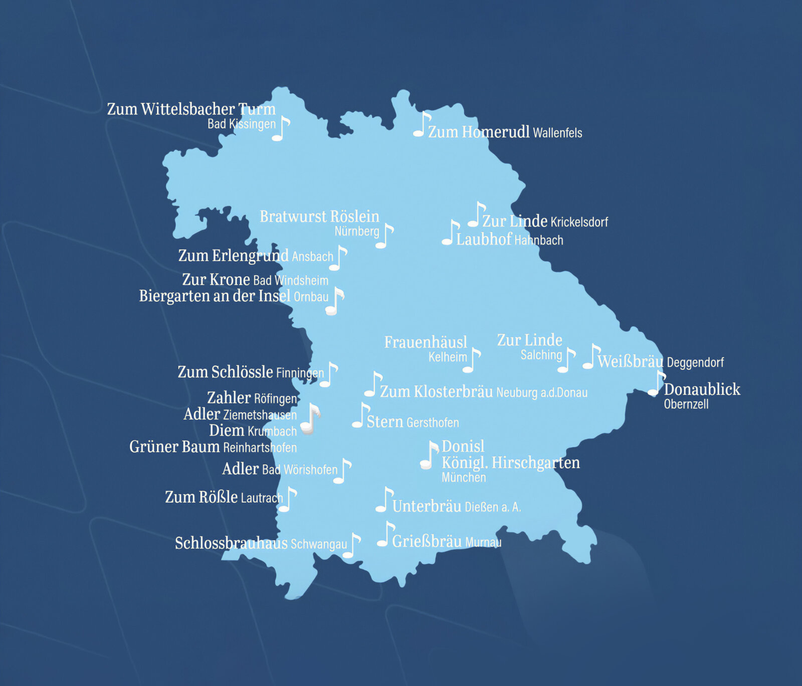 Oberbayern: Donisl, München; Gasthof Unterbräu, Dießen am Ammersee; Griesbräu zu Murnau, Murnau am Staffelsee; Königlicher Hirschgarten, München; Romantik Hotel Zum Klosterbräu, Neuburg a. d. Donau Niederbayern: Landgasthof Zur Linde, Salching; Landhotel Donaublick, Obernzell; Waldgaststätte Frauenhäusl, Kelheim; Weissbräu Deggendorf Oberpfalz: Laubhof, Hahnbach; Bierwirtschaft Zur Linde, Krickelsdorf, Hirschau Oberfranken: Gasthaus Zum Homerudl, Wallenfels Mittelfranken: Biergarten an der Insel, Ornbau; Bratwurst Röslein, Nürnberg; Wirtshaus zur Krone am Freilandmuseum, Bad Windsheim; Zum Erlengrund, Ansbach Unterfranken: Zum Wittelsbacher Turm, Bad Kissingen Schwaben: Gasthof Adler, Ziemetshausen; Gasthof Diem, Krumbach; Gasthof Stern, Gersthofen; Gasthof Zahler, Röfingen; Gasthof Zum Rößle, Lautrach; Hotel-Gasthof Adler, Bad Wörishofen; Landgasthof Grüner Baum, Großaitingen-Reinhartshofen; Schlossbrauhaus Schwangau, Schwangau; Hotel-Restaurant Zum Schlössle Finningen, Finningen
