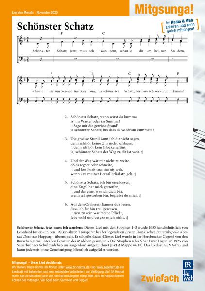 Schönster Schatz, jetzt muss ich wandern: Dieses Lied mit den Strophen 1–3 wurde 1980 handschriftlich von Leonhard Bauer – in den 1920er-Jahren Trompeter bei der legendären Ersten Fränkischen Bauernkapelle Konrad Dorn aus Happurg – übermittelt. Er schreibt dazu: »Dieses Lied wurde in der Hersbrucker Gegend von den Burschen gerne unter den Fenstern der Mädchen gesungen.« Die Strophen 4 bis 6 hat Ernst Löger um 1925 von Sauerbrunner Schulmädchen im Burgenland aufgezeichnet (BVLA Mappe 44/13).
